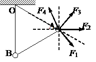 如图所示,用两根细线把A、B两小球悬挂在天花板上的同一点O,并用第三根细线连接A、B两小球,然后用某个力F作用在小球A上,使三根细线均处于直线状态,且OB细线恰好沿竖直方向,两小球均处于静止状态。则该力可能为图中的( )
