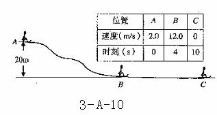 15.(05上海) (15分)如图3-A-10所示,某人乘雪橇从雪坡经A点滑至B点,接着沿水平路面滑至C点停止.人与雪橇的总质量为70kg.表中记录了沿坡滑下过程中的有关数据,请根据图表中的数据解决下列问题:
