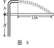 4.图8为推行节水灌溉工程中使用的转动式喷水龙头的示意图。“龙头”离地面高h m,将水水平喷出,其喷灌半径为10h m,每分钟可喷水m kg,所用的水从地面以下H m深的井里抽取。设所用水泵(含电动机)的效率为η,不计空气阻力。求:⑴水从龙头中喷出时的速度v0 ⑵水泵每分钟对水做的功W ⑶带动该水泵的电动机消耗的电功率P。