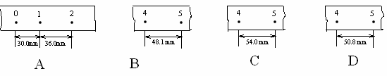 13.(4分)某同学在测定匀变速直线运动的加速度时,得到了几条较为理想的纸带,他已在每条纸带上按每5个点取好一个计数点,即两计数点之间的时间间隔为0.1s,依次打点先后为0,1,2,3,4,5。由于不小心,几条纸带都被撕断了,如下图所示,请根据给出的A、B、C、D四段纸带回答:从BCD三段纸带中选出从纸带A上撕下的那段应该是( )