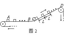 [例题4](2003年理综全国)一传送带装置示意图如图2所示,其中传送带经过AB区域时是水平的,经过BC区域时变为圆弧形(圆弧由光滑模板形成,为画出),经过CD区域时是倾斜的,AB和CD都与BC相切。现将大量的质量均为m的小货箱一个一个在A处放到传送带上,放置时初速为零,经传送带运送到D处,D和A的高度差为h。稳定工作时传送带速度不变,CD段上各箱等距排列,相邻两箱的距离为L。每个箱子在A处投放后,在到达B之前已经相对于传送带静止,且以后也不再滑动(忽略经BC段时的微小滑动)。已知在一段相当长的时间T内,共运送小货箱的数目为N。这装置由电动机带动,传送带与轮子间无相对滑动,不计轮轴处的摩擦。求电动机的平均输出功率P。