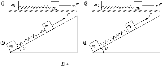 7、如图4,用相同材料做成的质量分别为m1、m2的两个物体中间用一轻弹簧连接。在下列四种情况下,相同的拉力F均作用在m1上,使m1、m2作加速运动:①拉力水平,m1、m2在光滑的水平面上加速运动。②拉力水平,m1、m2在粗糙的水平面上加速运动。③拉力平行于倾角为θ的斜面,m1、m2沿光滑的斜面向上加速运动。④拉力平行于倾角为θ的斜面,m1、m2沿粗糙的斜面向上加速运动。以△l1、△l2、△l3、△l4依次表示弹簧在四种情况下的伸长量,则有( )