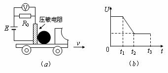 3.(宝山区)力电转换器的主要元件是压敏电阻,假设该压敏电阻的特点是其阻值R与承受的压力F之间满足FR=K,K为确定的常数。下图(a)是某同学设计的用来测定小车运动状态的原理图,R0为定值电阻。把压敏电阻固定在上表面光滑的小车上,绝缘重球紧靠压敏电阻放置。小车向右运动时,压敏电阻承受的压力通过电压表的示数反映出来,电压表示数与时间的关系如图(b)所示。关于小车的运动状态下列说法中正确的是( )