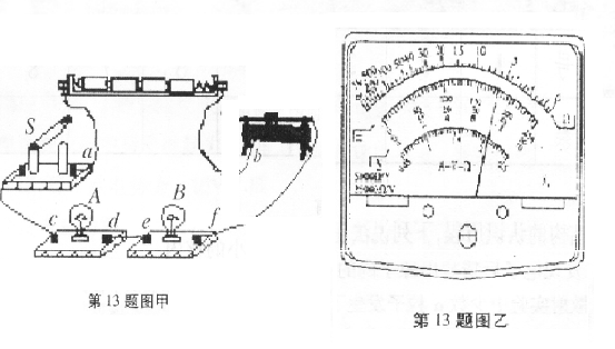 13.在如图甲所示的电路中,四节干电池串连,小灯泡A、召的规格为“3.8V,0.3A”。合上开关S后,无论怎样移动滑动片,A、B灯都不亮。