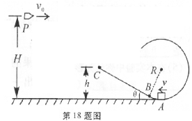 如图所示,半径R=0.3m的光滑圆弧轨道与粗糙斜面相切于月点,斜面最高点C距地面的高度h=0.15m,质量M=0.04kg的小物块从圆弧最低点A,以大小v=2m/s、方向向左的初速度开始运动,到斜面最高点C时速度为零,此时恰被从P点水平射出的质量m=0.01kg的弹丸击中,已知弹丸进人物块时速度方向沿着斜面,并立即停在物块内,P点距地面的高度H=1.95m,弹丸的水平初速度v0=8m/s,取g=10m/s2.求: