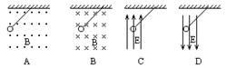 3、有一单摆的周期为T,将摆球带正电后,依次放入磁场和电场中,(如图示)使其从同一偏角开始摆动,其振动周期大于T的情形是( )