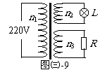 11.如图㈢-9,理想变压器初级线圈和两个次级线圈的匝数分别为n1=1760匝、n2=288匝和n3=8000匝,电源电压为U1=220V。n2上连接的灯泡的实际功率为36W,测得初级线圈的电流为I1=0.3A,求通过n3的负载R的电流I3。