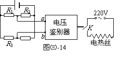 17.如图㈢-14所示,是在环境温度为10℃左右的条件下工作的某自动恒温箱原理简图。箱内电阻R1=20kΩ,R2=10kΩ,R3=40kΩ,R4为热敏电阻,其阻值随温度变化的图线如图㈢-15所示。当电压鉴别器两接入点a、b的电势φa<φb时,鉴别器将自动使电键K接通,使恒温箱内的电热丝发热,从而使箱内温度升高;当φa >φb时,鉴别器将使K断开,停止加热。求:⑴根据以上说明,判定该恒温箱内的温度将保持在多少摄氏度?⑵若想使恒温箱内的温度保持在30℃,在保持R1 、R2不变的情况下,应该把R3更换成阻值多大的定值电阻?