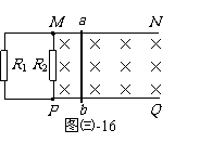 18.如图㈢-16,MN、PQ是两条水平放置的平行光滑导轨,其电阻可以忽略不计,导轨间距离l=0.60m。垂直于导轨平面向里的匀强磁场的磁感应强度B=0.40T。金属杆ab垂直于导轨放置,与导轨接触良好,ab杆在导轨间部分的电阻r=1.0Ω。在导轨的左端连接有电阻R1、R2,阻值分别为R1=3.0Ω和R2=6.0Ω。ab杆在水平拉力F作用下以v=5.0m/s的速度向右匀速运动。求:⑴通过ab杆的电流I ⑵拉力F的功率PF ⑶电阻R1上每分钟产生的电热Q1