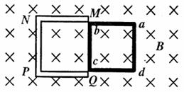 23.(14分)如图所示,空间存在着一个范围足够大的竖直向下的匀强磁场区域,磁场的磁感强度大小为B=0.6T.边长为L=0.5m的正方形金属框abcd(以下简称方框)被固定在光滑的绝缘水平面上,其外侧套着一个质量为m=0.4kg、与方框边长相同的U型金属框架MNPQ(以下简称U型框),U型框与方框之间接触良好且无摩擦.NP、bc、ad三边的电阻均为r=0.2Ω,其余部分电阻不计.U型框从图示位置开始以初速度v0=1.2m/s向右以a=-1.5m/s2作匀变速运动.问: .