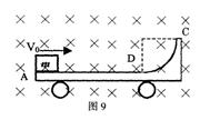 10、(19分)如图9所示,质量为M=3.0kg的小车 静止在光滑的水平面上,其AD部分是粗糙的水平导轨,DC部分是光滑的四分之一圆轨道,整个导轨由绝缘材料做成,并处于B=1.0T方向垂直纸面向里的匀强磁场中,今有一质量为 m=1.0kg的金属块(可视为质点)带有q:=2×10-3c的负电,它以v0=8m/s的速度冲上小车,当它将要通过D点时,它对水平导轨的压力为9.8lN,(g取9.8m/s)求: