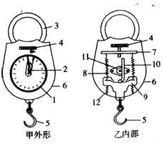 (16分)手提式袖珍弹簧秤是一种适合小商店和家庭用的便携式弹簧秤,它的外形如图甲,内部结构如图乙.它的正面是刻度盘1,中央有指针2,顶上有提环3,刻度盘上方有指针零点调节手轮4,在其下方有一横梁7,两根平行弹簧安装在横梁上,弹簧的下端与Y形金属片9相连.Y形金属片的中央有一齿条10与秤壳正中央的圆柱形齿轮11齿合.若圆柱形齿轮的半径为R=5/π cm,弹簧的劲度系数k均为500N/m,g取10m/s2.当弹簧秤调零后,此弹簧秤最多能测量多少千克的物体?