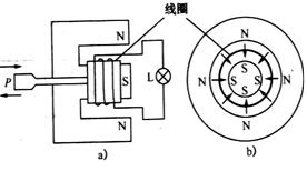 的电珠L,外力推动线圈的P端做往复运动,便有电流通过电珠。当线圈向右的位移随时间变化规律如图(c)。(x取向右为正)。试求:⑴这台发动机的输出功率(摩擦等损耗不计);⑵每次推动线圈运动过程中的作用力大小。