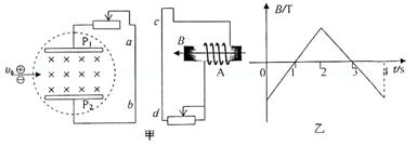 7.等离子气流由左方连续以v0射入P1、P2两板间的匀强磁场中,ab直导线与P1、P2相连接,线圈A与直导线cd连接。线圈A内有随图乙所示的变化的磁场,且磁场B的正方向规定为向左,如图甲所示,则下列叙述正确的是 ( )
