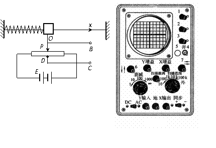 (2)为了研究弹簧振子的运动规律,可以用示波器观察在B、C间得到的电压信号的变化规律,请用线将B、C两点正确连接到示波器相应的接线柱上。这时“衰减”旋钮不能置于“ ”,“扫描范围”不能置于 档。若信号水平方向的幅度过小或过大,应该用 旋钮进行调整,若信号过于偏于屏幕下方,应该用 旋钮进行调整。
