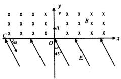 20.在图示区域中,x轴上方有一匀强磁场,磁感应强度的方向垂直纸面向里,大小为B,含有一质子以速度v0由y轴上的A点沿y轴正方向射入磁场,质子在磁场中运动一段时间以后从C点进入x轴下方的匀强电场区域中,在C点速度方向与x轴正方向夹角为45°,该匀强电场的强度大小为E,方向与y轴夹角为45°且斜向左上方,已知质子的质量为m,电量为q,不计质子的重力,(磁场区域和电场区域足够大)求: