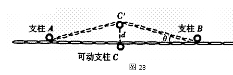 6.电梯修理员或牵引专家常常需要监测金属绳中的张力,但不能到绳的自由端去直接测量.某公司制造出一种能测量绳中张力的仪器,工作原理如图23所示,将相距为L的两根固定支柱A、B(图中小圆框表示支柱的横截面)垂直于金属绳水平放置,在AB的中点用一可动支柱C向上推动金属绳,使绳在垂直于AB的方向竖直向上发生一个偏移量