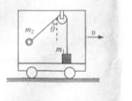 如图所示,质量为ml的物块放在车厢的水平底板上,用竖直细线通过光滑的定滑轮与质量为m2的小球相连.车厢正沿水平直轨道向右行驶,此时与小球相连的细绳与竖直方向成