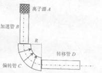 15.(8分)如图所示,A是能发射带电量为+q质量为m、初速度不计的离子源.离子源发射出的离子首先在竖直加速管B中加速,得到一定速率后进入内存辐向分布电场的偏转管C改变速度方向,然后从转移管道D中水平输出.已知加速管B中的加速电压为U,偏转管C是中心轴线半径为R的