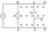 . ab与导轨间动摩擦因数μ=0.5,导轨电阻不计,现用F = 0.7N的恒力水平向右拉ab,使之从静止开始运动,经时间t=2s后,ab开始做匀速运动,此时电压表示数U=0.3V.重力加速度g = 10m/s2.求: