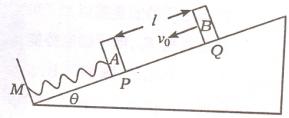 20.(12分)有一倾角为θ的斜面,其底端固定一档板,另有三个木块A、B、C,它们的质量分别为mA = mB = m,mC = 3m,它们与斜面间的动摩擦因数都相同.其中木块A和一轻弹簧连接,放于斜面上,并通过轻弹簧与档板M相连,如图所示.开始时,木块A静止在P点弹簧处于原长,木块B在Q点以初速度U0沿斜面向下运动,P、Q间的距离为l,已知木块B在下滑过程中做匀速直线运动,与木块A碰撞后立刻一起沿斜面向下运动,但不粘连,它们到达一个最低点后向上运动,木块B向上运动恰好能回到Q点.现将木块C从Q点以初速度