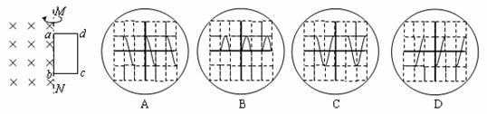 19、如图所示,在理想边界MN的左侧空间存在一匀强磁场,其方向垂直纸面向里,在MN右侧有一矩形金属线圈abcd,ab边与MN重合。现将a、b两端分别连接到示波器的输入端,同时使线圈以ab边为轴从图示位置按图示方向匀速转动,则从示波器中观察到a、b两端电压uab随时间t变化的图象是: