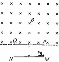 16、(11分)如图所示,MN、PQ是平行金属板,板长为L两板间距离为d,在PQ板的上方有垂直纸面向里足够大的匀强磁场.一个电荷量为q,质量为m的带负电粒子以速度V0从MN板边缘且紧贴M点,沿平行于板的方向射入两板间,结果粒子恰好从PQ板左边缘飞进磁场,然后又恰好从PQ板的右边缘飞进电场.不计粒子重力,求: