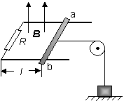 =1T/s在增加,水平导轨的电阻和摩擦阻力均不计,导轨宽为0.5m,左端所接电阻R=0.4Ω。在导轨上l=1.0m处的右端搁一金属棒ab,其电阻R0=0.1Ω,并用水平细绳通过定滑轮吊着质量为M=2kg的重物,欲将重物吊起,问: