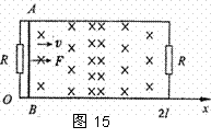 如图15所示,矩形裸导线框长边的长度为2l,短边的长度为l,在两个短边上均接有电阻R,其余部分电阻不计。导线框一长边与x轴重合,左边的坐标x=0,线框内有一垂直于线框平面的磁场,磁场的磁感应强度满足关系B=B0sin(