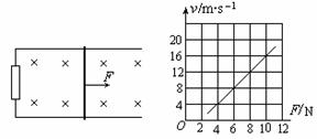 9.水平面上两根足够长的金属导轨平行固定放置,问距为L,一端通过导线与阻值为R的电阻连接;导轨上放一质量为m的金属杆(见右上图),金属杆与导轨的电阻忽略不计;均匀磁场竖直向下.用与导轨平行的恒定拉力F作用在金属杆上,杆最终将做匀速运动.当改变拉力的大小时,相对应的匀速运动速度v也会变化,v与F的关系如右下图。(取重力加速度g=10m/s2)
