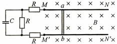 14.两根光滑的长直金属导轨导轨MN、M'N'平行置于同一水平面内,导轨间距为l,电阻不计,M、M'处接有如图所示的电路,电路中各电阻的阻值均为R,电容器的电容为C。长度也为l、阻值同为R的金属棒ab垂直于导轨放置,导轨处于磁感应强度为B、方向竖直向下的匀强磁场中。ab在外力作用下向右匀速运动且与导轨保持良好接触,在ab运动距离为s的过程中,整个回路中产生的焦耳热为Q。求: