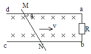 架在平行导轨上,并以匀速v滑动(平移),v的方向和da平行,杆MN有电阻,每米长的电阻值为R,整个空间充满匀强磁场,磁感应强度的大小为B,方向垂直纸面(dabc平面)向里。