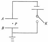 如图所示,平行板电容器的两极板A、B通过开关K与直流电源相连接。当K接通时,放入板间的带电液滴P刚好处于静止状态。现将K断开,保持A板不动,而将另一与大地相接的B板下移一小段距离,则( )