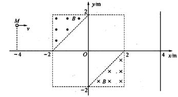 13.(14分)如图所示,在直角坐标系的第II象限和第Ⅳ象限中的直角三角形区域内,分布着磁感应强度均为B=5.0×10-3T的匀强磁场,方向分别垂直纸面向外和向里。质量为m=6.4×10-27kg、电荷量为q=+3.2×10-19C的α粒子(不计α粒子重力),由静止开始经加速电压为U=1250V的电场(图中未画出)加速后,从坐标点M(-4,