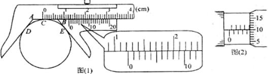 22.(18分)Ⅰ.1有一种在工厂实际使用的游标卡尺如图所示,它是普通游标卡尺的变形。它把普通游标卡尺两个卡脚改成了斜的,两个斜卡脚与主尺都成126°52′12″(图中的∠DAC=∠EBC=126°52′12″,已知tan63°26′06″=2.000),其他部分未作改动,这种卡尺专门用来测量圆柱形或球形工件的外径。两个斜卡脚之间不放被测工件时,游标尺的“0”刻线恰与主尺的“0”刻线对齐,图(1)中的A、B两点重合。两个斜卡脚之间放上被测圆柱形或球形工件,使工件与主尺、两斜卡脚都相切,即共有三个切点,如图(1)中的C、D、E。如图(1)所示卡尺的读数为________mm,被测圆形工件的直径为________mm。