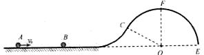23.(16分)如图所示,水平轨道与圆弧CFE用平滑曲面连接,不计一切摩擦,圆弧轨道半径R=0.3m。在水平轨道上有大小相同的两小球A、B,B球质量mB=0.2kg,A球质量mA=0.1kg。开始时,B球静止在水平轨道上,A球以v0=5m/s的速度向右运动与B球正碰,碰后B球运动到圆弧轨道的最高点F时,对轨道的压力恰好为零,试求碰撞后A球的速度。(重力加速度g取10m/s2)