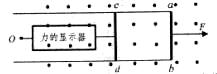 24.(18分)如图所示,在光滑的水平桌面上,放置一两边平行的质量为M,宽为L的足够长的“U”开金属框架,其框架平面与桌面平行。其ab部分的电阻为R,框架其它部分电阻不计。垂直框架两边放一质量为m、电阻为R的金属棒cd,它们之间的动摩擦因数为μ,且接触始终良好。cd棒通过不可伸长的细线与一个固定在O点力的显示器相连,始终处于静止状态。现在让框架由静止开始在水平恒定拉力F的作用下(F是未知数),向右做加速运动,设最大静摩擦力和滑动摩擦力相等。最终框架匀速运动时力的显示器的读数为2μmg。已知框架位于竖直向上足够大的匀强磁场中,磁感应强度为B。求