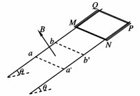 4.(宣武区)用质量为m、总电阻为R的导线做成边长为l的正方形线框MNPQ,并将其放在倾角为θ的平行绝缘导轨上,平行导轨的间距也为l,如图所示。线框与导轨之间是光滑的,在导轨的下端有一宽度为l(即ab=l)、磁感应强度为B的有界匀强磁场,磁场的边界aa′、bb′垂直于导轨,磁场的方向与线框平面垂直。