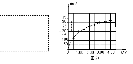 (3)利用实验中得到实验数据在图24所示的I-U坐标系中,描绘得出了小灯泡的伏安特性曲线。根据此图给出的信息,若把该灯泡接到一个电动势为3.0伏,内阻为10Ω的直流电源时小灯泡发出的实际功率约为 。 (结果保留两位有效数字)