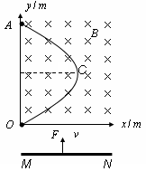 ,C为导轨的最右端,导轨OA与OCA相交处的O点和A点分别接有体积可忽略的定值电阻R1和R2,其R1=4.0Ω、R2=12.0Ω。现有一足够长、质量m=0.10kg的金属棒MN在竖直向上的外力F作用下,以v=3.0m/s的速度向上匀速运动,设棒与两导轨接触良好,除电阻R1、R2外其余电阻不计,g取10m/s2,求: