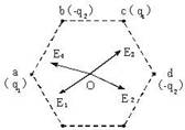 如图,在正六边形的a、c两个顶点上各放一带正电的点电荷,电量的大小都是q1,在b、d两个顶点上,各放一带负电的点电荷,电量的大小 都是q2,q1>q2。已知六边形中心O点处的场强可用图中的四条有向线段中的一条来表示,它是哪一条?( )