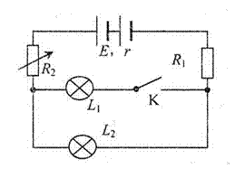 (8分)如图所示的电路中已知电源动势E=36V,内电阻r=20Ω,R1=20Ω,每盏灯额定功率都是2W,额定电压也相同。当K闭合将电阻箱 R2调到R2=14Ω时,两灯都正常发光;当K断开后为使L2仍正常发光,求R2应调到何值?