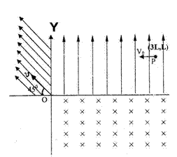 倍,在第四象限内有一垂直于平面向内的匀强磁场,现有一质量为m,带电量为q的负粒子(重力不计)以初速度v0沿x轴负方向从坐标为(3L,L)的P点开始运动,接着进入磁场后由坐标原点O射出,射出时的速度方向与x轴负方向夹角为45°。求:
