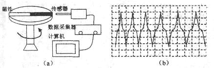 (3)数字信息系统(DIS)被广泛应用在物理实验中。该系统可以迅速测量、处理数据,并自动生成图像.如图(a)所示,一条形磁铁同定在水平转台上,磁铁长度等于圆台直径,一磁传感器放置在转台边缘,磁传感器可测量探头所在位置沿探头方向的磁感应强度.实验后显示器得出曲线如图(b)所示。图中横坐标表面时间,纵坐标表示磁感应强度.