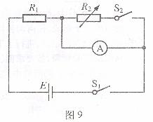 ,电源电动势E=1.0 V,内阻不计。当开关S1闭合、S2断开时,电流表指针偏转到满刻度;当S1、S2 均闭合时,调节R2,当R2=500