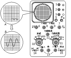 ⑵某示波器工作时,屏上显示出如右上图所示的波形,且亮度较弱。要将波形由A图位置调节到B图的位置和波形,示波器面板上的旋钮需要调节的是