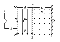 (18分)如图所示,K与虚线MN之间是加速电场。虚线MN与PQ之间是匀强电场,虚线PQ与荧光屏之间是匀强磁场,且MN、PQ与荧光屏三者互相平行。电场和磁场的方向如图所示。图中A点与O点的连线垂直于荧光屏。一带正电的粒子从静止被加速后,由A点离开加速电场,速度方向垂直于电场方向射入偏转电场;在离开偏转电场后进入匀强磁场,最后恰好垂直地打在图中的荧光屏上。已知电场和磁场区域在竖直方向足够长,加速电场电压U与偏转电场的场强关系为U=Ed/2,式中的d是偏转电场的宽度且为已知量。磁场的磁感应强度B与偏转电场的电场强度E和带电粒子离开加速电场的速度v0关系符合表达式v0=E/B,如图所示。试求:⑴磁场的宽度L为多少?⑵带电粒子最后在电场和磁场中总的偏转距离是多少?