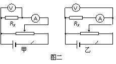 ②第二步中甲、乙两位同学用以下器材测量电阻Rx的阻值,他们各自设计的实验电路如图二所示。