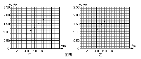 ④甲、乙两同学各自用自己设计的电路进行了测量,并分别利用实验中记录的6组数据画出U-I图线,如图四所示。请根据你选择的方案由图线算出被测电阻的阻值Rx=___Ω。