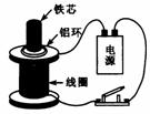 绕有线圈的铁芯直立在水平桌面上,铁芯上套着一个铝环,线圈与电源、电键相连,如图所示.闭合电键的瞬间,铝环跳起一定高度.保持电键闭合,下面哪一个现象是正确的 ( D )